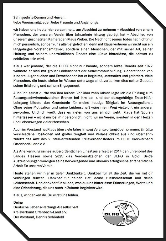 Trauerrede von Dennis Schönfeld - 1. Vorsitzender DLRG Kreisverband Offenbach-Land e.V.